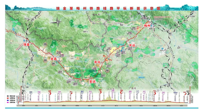 瑞梅铁路是国家“十四五”重点工程项目。线路北起江西省瑞金市,向南经赣州市会昌县、安远县至寻乌县,经广东省梅州市平远县、梅江区,接入漳平至龙川铁路梅州站,为国家Ⅰ级单线电气化客货共线铁路。