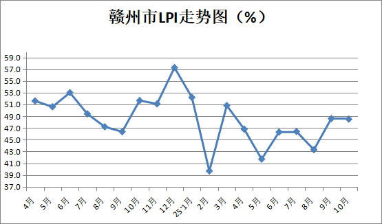赣州市物流协会发布的2025年10月份赣州市物流业景气指数为48.5%。