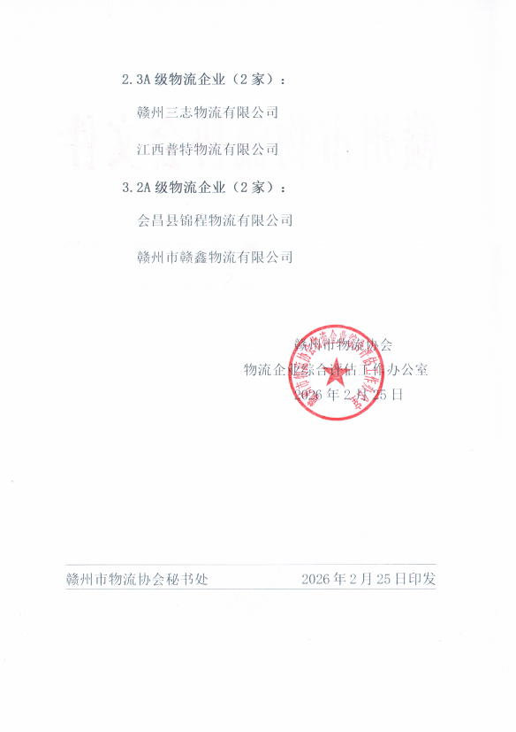 根据中国物流与采购联合会下发的《关于发布第四十一批A级物流企业名单的通告》(物联评估字[2026]19号)文件内容,经赣州市物流协会物流企业综合评估工作办公室开展新评、升级、复核工作的物流企业,共计6家通过了本批次的A级企业评估,名单公布如下:
