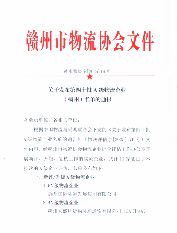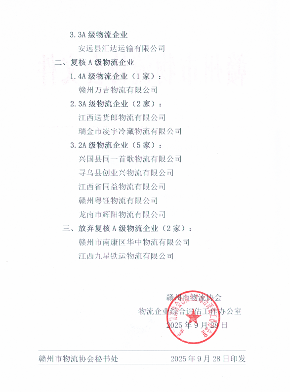 根据中国物流与采购联合会下发的《关于发布第十批A级物流企业名单的通告》(物联评估字[2025]176号)文件内容,经赣州市物流协会物流企业综合评估工作办公室开展新评、升级、复核工作的物流企业,共计11家通过了本批次的A级企业评估,名单公布如下: