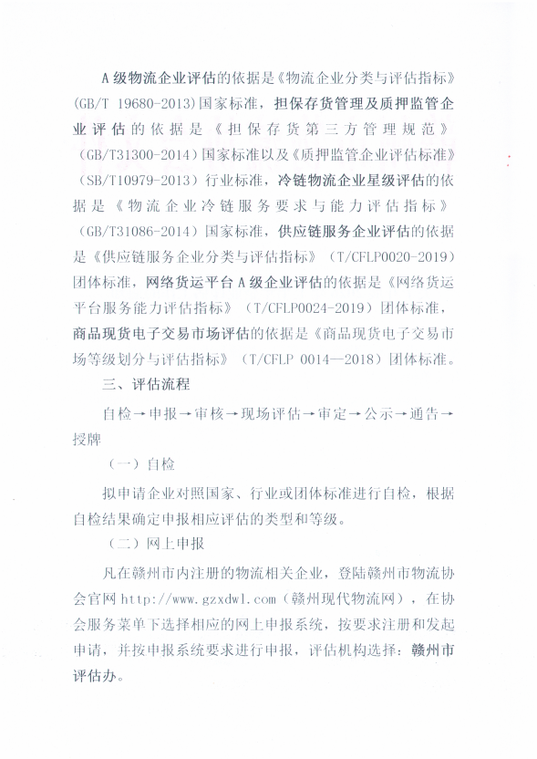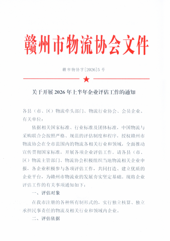 依据相关国家标准、行业标准及团体标准,中国物流与采购联合会按照严格、规范的评估制度和程序,授权赣州市物流协会在全市范围内的物流各相关行业和领域,全面推动宣传贯彻国家标准,开展各项企业评估工作。请各县(市、区)物流主管部门、物流协会积极组织当地物流相关企业申报,各企业积极参与各项评估工作,共同打造、建立优质的企业平台,为赣州市物流业的发展夯实坚定基础。现将企业评估工作的有关事项通知如下:
